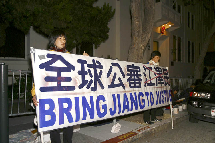 截至2004年5月26日,已经证实至少有968名法轮功学员被江氏集团迫害致死。学员表示,今天来到旧金山中领馆,就是要揭露江氏集团犯下的罪行。中领馆是江氏集团在海外的代表,江氏集团通过其使领馆将迫害延伸到海外,并散布诬蔑法轮功的不实之词,毒害在海外的中国人。我们来这里清除邪恶,支持芝加哥诉江案的進行。这是我们大法弟子又一次整体参与正法的行动。