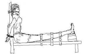 法轮功学员因不放弃自己的信仰在中国大陆的看守所、劳教所等非法关押场所遭受到的常见酷刑之一:老虎凳。
