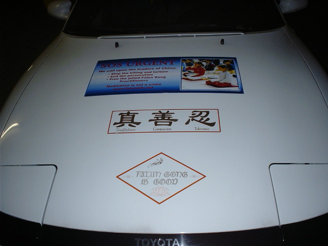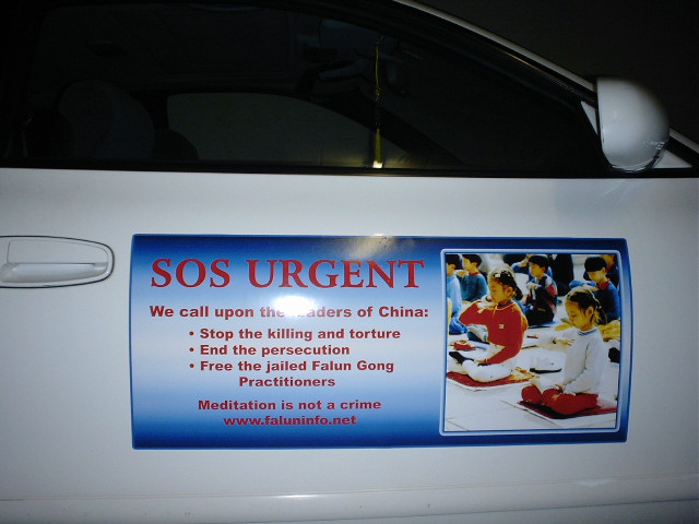 如照片所示,我们在汽车上贴了关于法轮功真象的图片和要求停止镇压的文字。公众的反应非常好。看了汽车上的信息后,很多人开始和我们谈法轮功遭受迫害真象的问题。