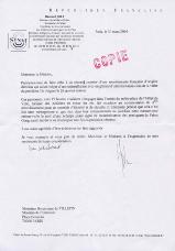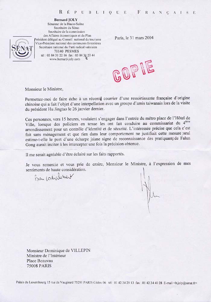 【明慧网2004年5月29日】3月31日,法国参议员贝尔纳-若力致函内政部长维尔潘先生,对法国警察骚扰法轮功学员的行为表示关注。