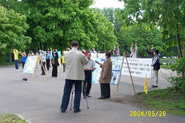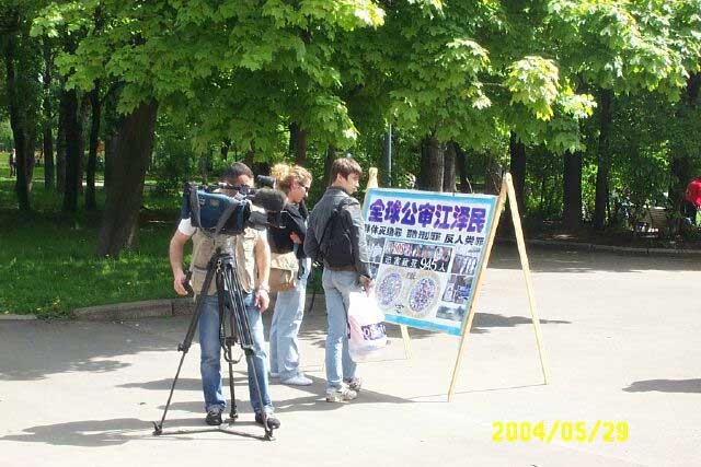 莫斯科一家电视台進行了现场采访。有很多的过路人驻足观看展板。一位住在使馆附近的退休老人,每次学员们在使馆前集会他都是远远的离开集会的地方。这次他从一开始就站在江氏集团迫害法轮功的展板前认真的看,还认真的听学员给他讲解,他讲:对这样好的人進行这样残酷的迫害,我无法理解。还有不少了解真象后的年轻人对在中国发生的迫害感到震惊,并表示:应该制止迫害。