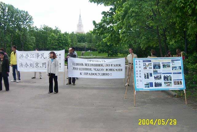 【明慧网2004年5月31日】2004年5月27日,在芝加哥的美国联邦法院第七巡回法庭上诉庭开庭就诉江案進行法庭辩论。2004年5月29日,莫斯科和来自圣-彼得堡、卡鲁纳市的俄罗斯大法弟子在莫斯科中使馆前集会,支持芝加哥诉江案,并揭露江氏集团在中国对法轮功学员的残酷迫害
