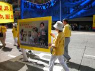 ”大游行,要求中国江氏集团释放被关押的法轮功成员,并停止迫害。