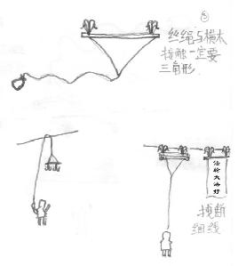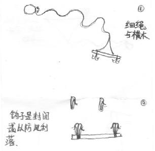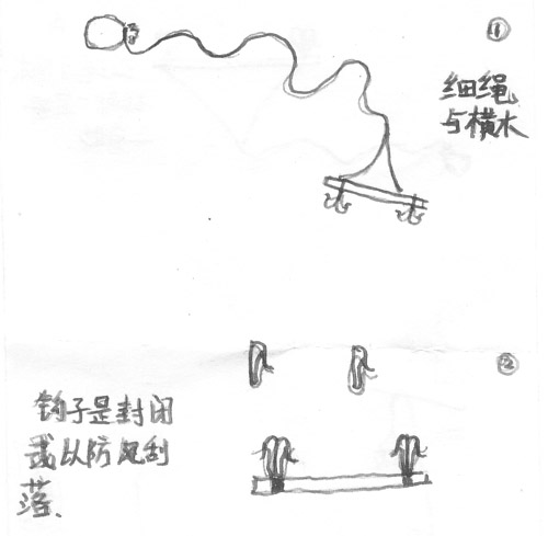 高处挂条幅如果拿一个大竹竿,是又费事又显眼,很不方便。用一根细丝绳,一头拴好一个重物(做一个布口袋,里面装好细沙子,拴好)图1. 丝绳这边用横木穿好条幅,横木上条幅用线缝或双面胶固定。然后用铁丝做好铁钩,图2. 然后用力一甩,重物飞过高挂处又落了下来,然后轻轻一拽细丝绳,将条幅拽上挂好,因为横木正反两头都是铁钩,所以它在空中如何摆动,总又一面可以钩上,丝绳与条幅连接处用细缝衣服用的线,图3.挂好后,一使劲拽,细线断了,细线缠着条幅,线一断,条幅“啪”便打开,图4、5。
