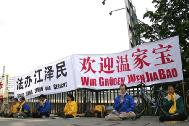 【明慧网2004年5月6日】在温家宝总理访问柏林的两天多时间里,法轮功学员打出了“欢迎温家宝”、“法办江泽民”的横幅标语,但是中国代表团要求取缔“法办江××”的标语,称“法办江××”是判江死刑。德国心理学专家说,这表明参与迫害的人,以及那些维护他们的人,很明白这些迫害行为在一般国际法律上的后果。
