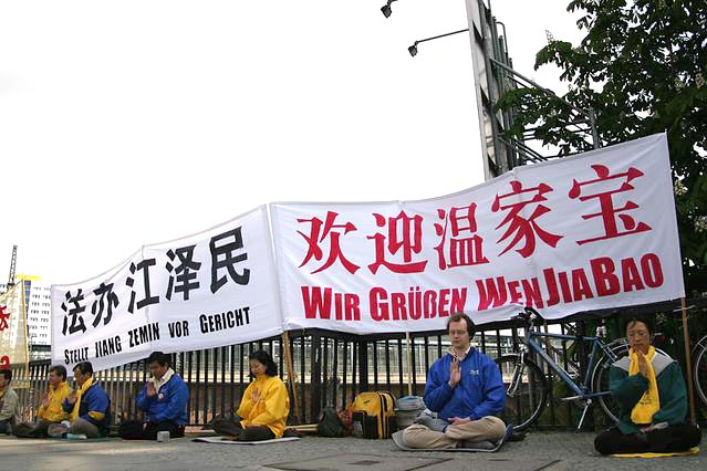自由亚洲电台5月5日报导,5号上午,中国总理结束了对德国的访问,前往欧盟首都布鲁塞尔。在温家宝总理访问柏林的两天多时间里,中国代表团和外交人员就法轮功学员和示威民众打出的标语口号,向德国警察施加压力,要求取缔这些标语,这使得德国警方感到非常困惑和为难。