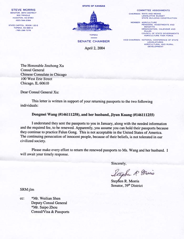 据我了解,他们夫妇在一月份已将护照以及护照延期所必须的所有材料和费用,一起寄给贵领馆办理护照延期。显然,因为他们继续修炼法轮功,你以为就可以扣压他们的护照。这种行为在美国是不能接受的。因为他们的信仰,就迫害无辜的民众,这在我们文明社会是不能容忍的。