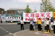 ![]() 法轮功学员们在布鲁塞尔打出的横幅 | ![]() 在德国柏林举行的中德高科技论坛会场外打出横幅 | ![]() 在温家宝一行下榻的Sheraton饭店前炼功,发正念 |