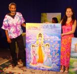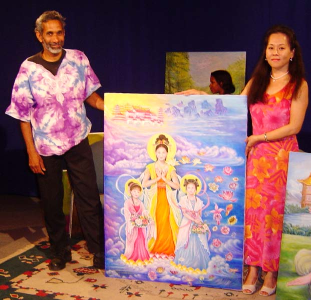 作为一名业余画家,夏琼芬提到她的绘画的能力是来自于天生的。在修炼法轮功之前,她的作画只是为了取悦大家而画。7年前开始修炼法轮功以后,作画风格有所改变,一种宁静,沉稳,愉悦的风貌,渐渐呈现在画布上。夏女士介绍道:“自从修炼法轮功以后,我认为自己从内心改变了。我开始感觉我的心变的非常纯净,安宁和舒服。我感觉要把它表达出来。特别是看人们炼功时。我能感觉到他们炼功时的平和舒适。当我开始画这副画时,(一位女孩伸展手臂炼功的画)我试着将那种感觉表现在这画面上,我真希望当人们看到这幅画时也能感到和平与舒适。”她随后说:“李洪志先生将这套功法传出已有12年了。5年前,中国政府规定禁止修炼法轮功。中国政府通过媒体制造谎言,当时有1亿多人修炼,很多修炼者遭到迫害。这是套性命双修的功法,刚才我所讲的是修身的部分,修心部分我们追寻的是宇宙真,善,忍特性来修。”