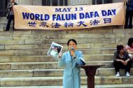 Clearine Hunter 女士在开幕词中向法轮功创始人李洪志先生致以崇高的敬意,感谢他把大法带给这个世界,陈述了5月13日---世界法轮大法日的起源和意义,大法洪传12周年的历程,呼吁所有善良的人伸出援手共同制止正在中国发生的对信仰“真-善-忍”的法轮功学员的惨无人道的酷刑迫害。