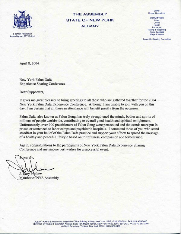 【明慧网2004年6月10日】纽约州议员加里-普里勒(J. Gary Pretlow)4月8日致信纽约法轮大法学员,向前来参加2004年纽约法轮大法心得交流会的所有与会者们表达问候。他表示,虽然不能亲自参加,但相信所有与会者一定会从交流会中受益匪浅。