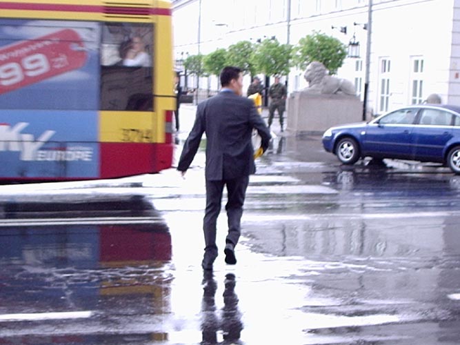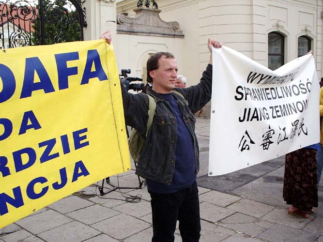 中波两国领导人在总统府会晤的同时,中方在总统府前欢迎中国代表团的部分人员对同时在总统广场请愿的人群和路人進行挑衅骚扰,引起了媒体和警方关注。波兰《选举报》(Gazeta Wyborcza)在6月9日头版刊登了文章说:用红色横幅“武装”起来的一组中国人试图挡住法轮功成员手中写有“严惩江泽民”字样的横幅,一名中国使馆的工作人员证实了这是中国使馆派来的队伍。