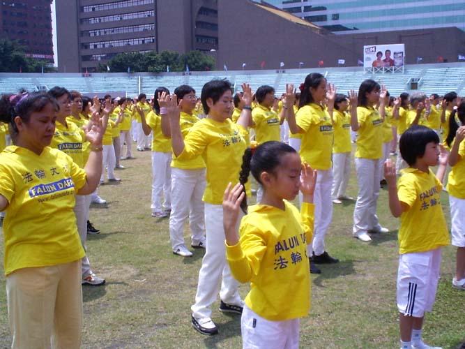 大会活动开始,台北市长马英九表扬了参加表演的运动团体,分别授予奖项。共有八个团体受邀表演。身穿黄色上衣的千名法轮功学员整齐划一的炼功动作十分耀眼。台上主持人在看完功法展示后惊讶的表示,原来法轮功是不分年龄都可以学。她注意到第一排站的都是小弟子,其中年纪最小的才2岁多,五套功法的动作与其它学员一致,完全没有出错,令她啧啧称奇。她要求代表发言的洪吉弘先生,将法轮大法的精神告诉全场的观众,让更多人有進一步的认识。洪先生简单介绍法轮大法是性命双修功法,重视心性修炼的一种功法,完全义务教功,欢迎大家学炼。