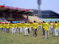 【明慧网2004年6月13日】6月12日于台北市立体育馆举行的2004年台北市老人运动健康大会。由于主办单位─台北市老人基金会的积极邀约,总共有千名法轮功学员参加,热情支持台北市政府鼓励老年人户外运动,同时婉拒了大会所提供每位参加学员100元的园游券,法轮功学员无私的付出令主办单位感动。