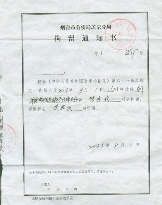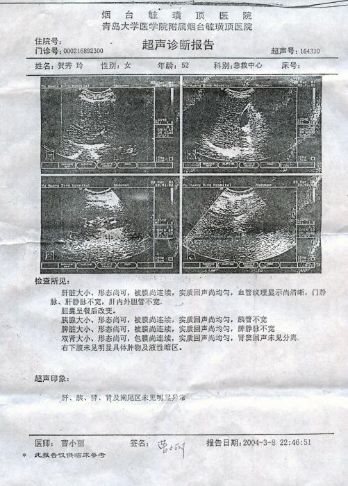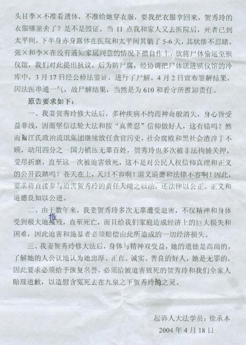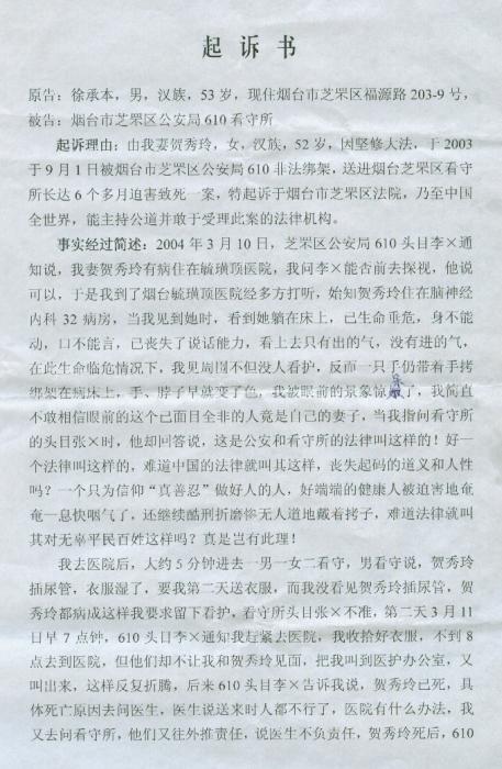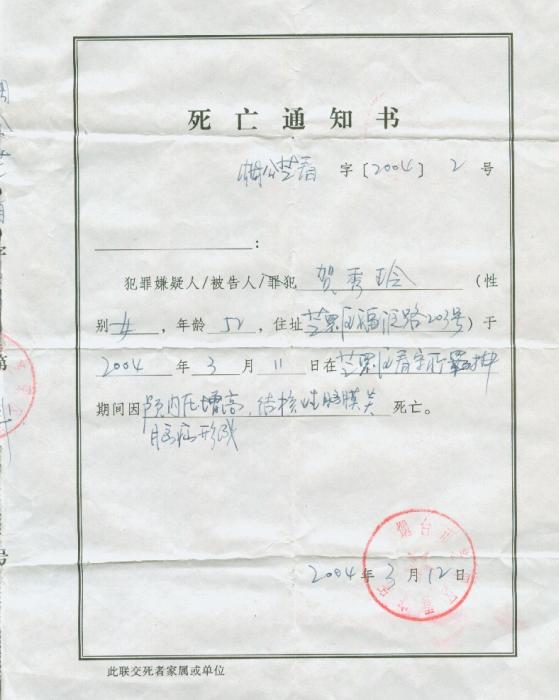 2004年3月4日以610头目李X及看守所头目张X为首,将贺秀玲送進烟台市毓璜顶医院,贺秀玲拒绝药物注射,610、看守所与医院串通一气,强行给她注射药物,做手术腰穿刺,导致贺秀玲死亡,这一切违法行为都没有通知家属。