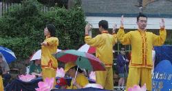 2004年6月12日纽约法轮功学员应邀首次参加布碌伦西班牙社区的“旗帜游行”。 游行结尾处各游行队伍留影,各色旗帜在高墙上排列,大法横幅“法轮大法好”和“真善忍”在高处是那么的壮观醒目,一个华人高兴的看着这一切,欣然接过真象资料,另一位在手机中大声和对方说着:“法轮功”,还问我们有没有表演。