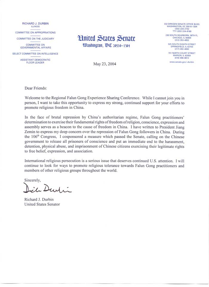 【明慧网2004年6月16日】2004年5月芝加哥美中法会期间,收到数名来自联邦和伊州参众两院议员的贺信,祝贺法会的成功,赞扬法轮大法为当地的人民带来的美好,同时谴责在中国大陆江氏集团的残酷迫害,呼吁早日结束对善良的民众的迫害。
