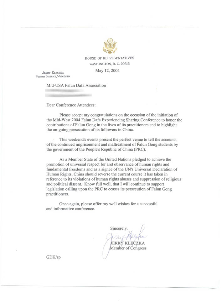 美国联邦众议员杰瑞.克莱斯卡Jerry Kleczka)的贺信。