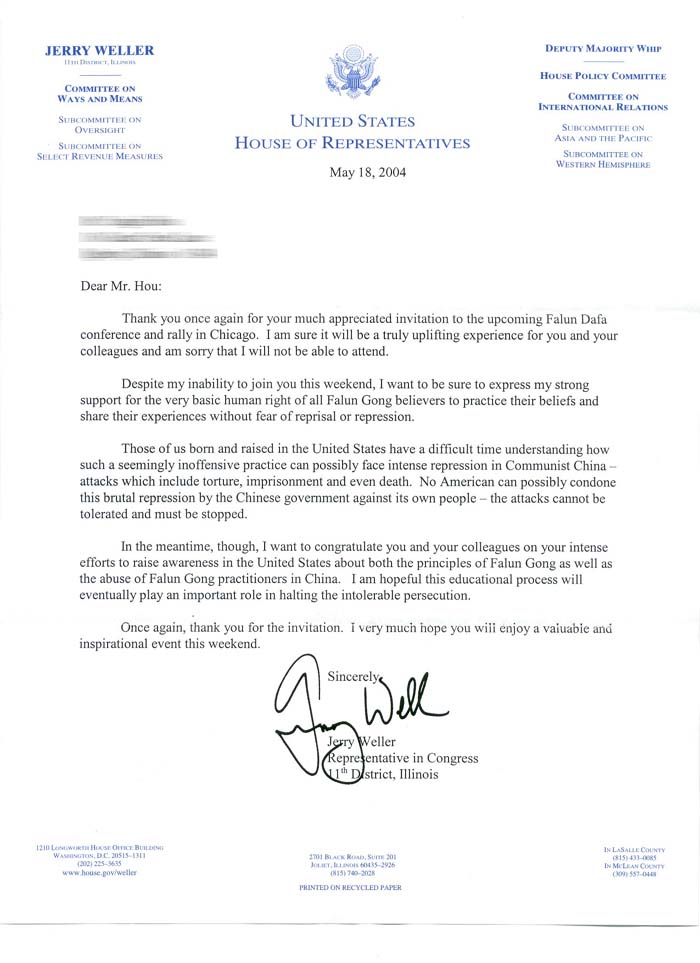 美国联邦众议员杰瑞.维勒(Jerry Weller)在来信中首先对法轮功学员为维护信仰而表现出的非暴力行为表达了他最强烈的支持。他说:“在美国成长的人们很难想象并面对在中国大陆法轮功学员所遭受的酷刑,劳教甚至是死亡。美国人民不允许这样残酷的镇压还在持续。”同时他赞扬了在中国大陆和海外的法轮功学员在过去的几年里持续不断的努力,和法轮大法所表达的理念已经引起了美国主流社会的关注。