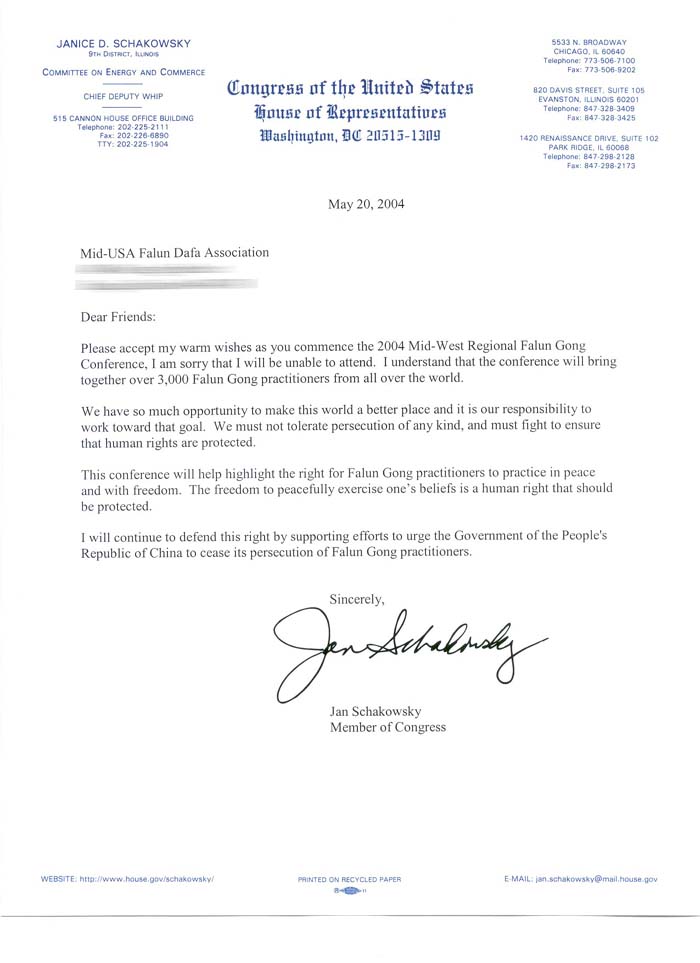 美国联邦众议员简.斯考斯凯(Jan Schakowsky)在来信中说:“每一个人都有义务和责任让我们的世界变得更加美好,法轮功学员所表现出的和平,以及功法本身是值得被保护的,我将继续呼吁早日停止在中国大陆对法轮功的迫害。”