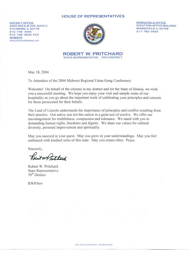 伊州众议员罗伯特.布里查德 (Robert W. Prichard) 在贺信中表示:“伊州是林肯的土地,我们非常理解目前法轮功学员的遭遇,同时我们也鼓励我们的民众接受真善忍的理念,我们永远和你们站在一起。”