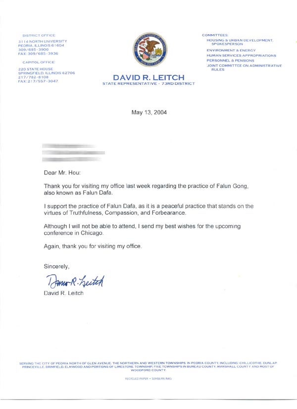 伊州众议员大为.雷池(David R. Leitch) 在赞扬了法轮大法所弘扬的真善忍的理念和平和的功法的同时,还对法轮功学员送去最真挚的祝福。