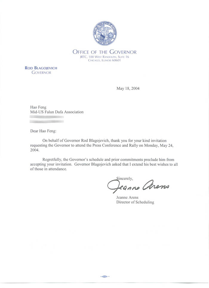 伊州州长办公室珍妮.尔仁(Jeanne Arens)代表伊州州长罗得.布拉高维杰(Rod Blagojevich) 的贺信。