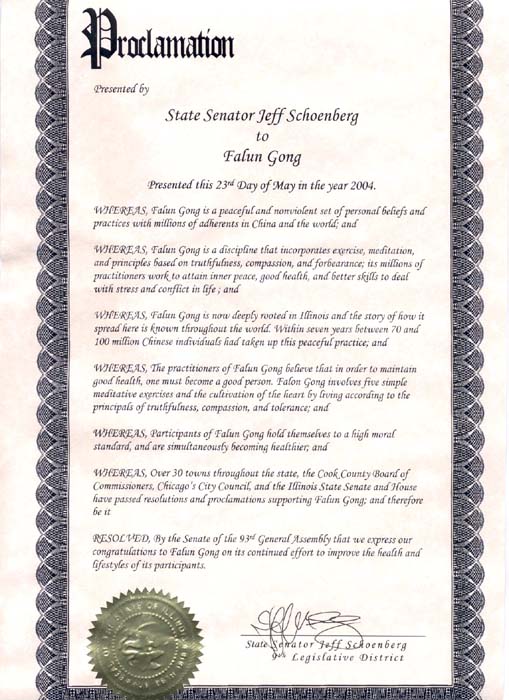 至此,在第93届伊州参议院大会上,我们对法轮功学员在提高自我健康和生活品质的努力所取得的成就表示衷心的祝贺。