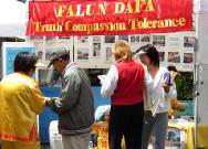 “西西里文化节”是当地社区的一个重要活动,吸引众多居民的参与。今年是法轮功学员首次申请参加该活动,几位学员一早就来到参展地点,将展位布置得既清新整洁又祥和,大法横幅和图片都合理地安排好位置,大法书籍和资料等整齐地摆放在桌子上。此外,在全天的活动中,有几名学员不间断地演示五套功法或发正念,其他学员则向观众讲解和发放资料。前来展位参观的民众有的人当场就学炼了法轮功功法,有人则表示要到附近的炼功点学功。更多的人则是静静地观看功法表演和向学员了解真象情况,许多人表示以前在各种游行活动中就看到过法轮功学员。