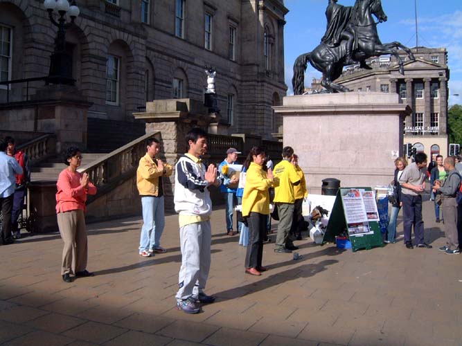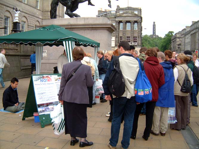 学员们在爱丁堡市中心设置了法轮大法信息展位,告知人们正发生在中国的群体灭绝罪行的真实情况。数百位民众在主张江××要为迫害夺走960条人命负责的请愿书上签名。(据中国官方文件的数据——实际被迫害致死的人数达数千人。)