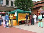 法轮功学员们搭起了一个大帐篷,并悬挂黄底红字写有中英文“法轮大法”、“真善忍”的横幅,祥和的集体炼功和优美平和的音乐吸引了很多路人观看。有许多人询问这是什么,还有一些人马上记下了当地炼功点的地址,表示要来学功。很多人听完真象后,都愿意签名支持法轮功。还有些人甚至留下自己的地址,希望学员给他们寄去更详细的真象材料。