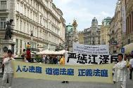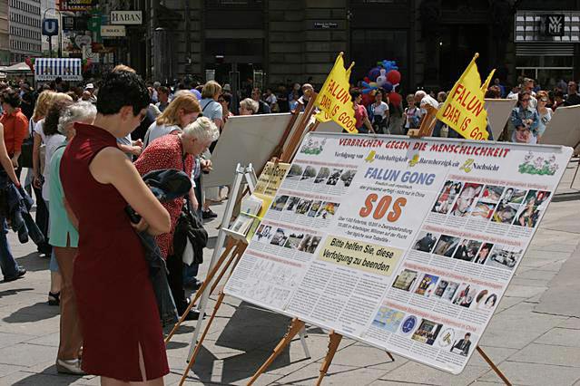 大街两旁站满了市民和游客。他们向法轮功学员的腰鼓队、莲花舞等报以掌声,并对每日发生在中国的酷刑演示露出惊异和难过的表情。部分法轮功学员身着当地民族服装,向人们反映出欧洲各民族人民得法后的喜悦。