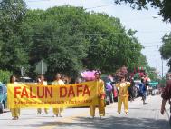 有位六岁的小弟子从头到尾走过来,炎热的天气使得她的小脸红红的,这位小弟子的左边胳膊绑着绷带,一路上用右边胳膊专注的给人们发着材料,而她的姐姐为了向更多的人们散发材料,把原来装有食物的背包腾空,放上大法真象材料,只留了一瓶水在身上,这些孩子们的纯朴的心感动了许多观众。