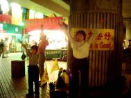 下午三、四点是小学放学的时间,学校外,通常会有大批的家长聚集,等待接他们的小孩。这天我们到附近的兴隆国小,准备炼功洪法,却一直找不到合适的地点,忽然看到学校对面一排商店,其中一扇铁门是关着的,刚好可以挂横幅,场地大小也适合炼功,于是我们去敲了门,出来一位老太太,说明来意后,她很爽快的答应了我们的请求。