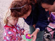 在舞台下,法轮功学员设置的展位上,摆满了具中国特色的装饰品和中国食品,观众们可以随意品尝中国茶和小吃。学员们向观众发放法轮功简介并教他们叠纸莲花,许多人饶有兴趣的学着做。