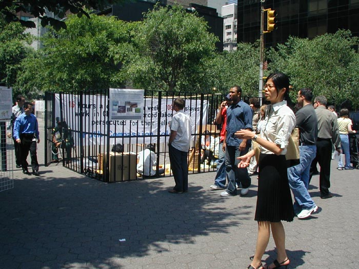 广场位于交通要道,车辆人流来往不断。去联合国上班的工作人员,来参加会议的各界要人,以及各大媒体,很多都要经过这个广场。白底蓝字的横幅“公审江泽民”、“停止迫害法轮功”,以及各式酷刑展板向人们叙述着正在中国发生的邪恶镇压,呼吁善良的人们站出来反对这场迫害。同时,黄底红字的横幅“法轮大法好”和学员的集体炼功溶和在一起,和邻近的酷刑迫害展示形成了鲜明的对比。