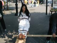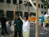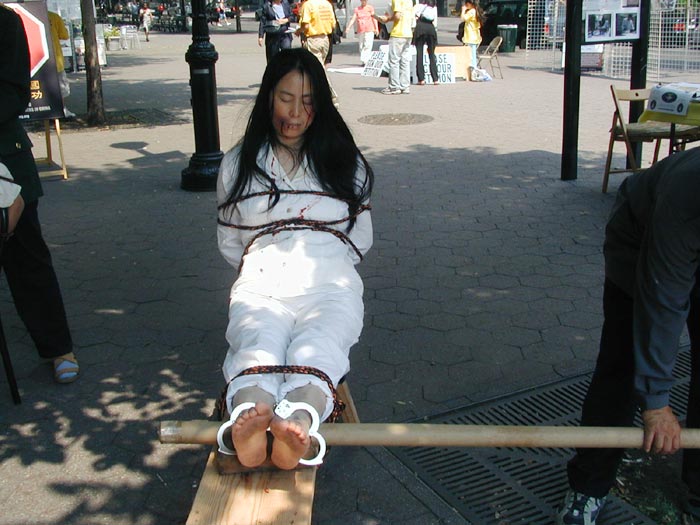 这次酷刑展学员们真实的展示了在中国大陆劳教所、监狱里普遍用来迫害法轮功学员的一些酷刑“老虎凳”、“用烧红的铁棍烙烧皮肉”、“吊打”、“摧残性灌食”。