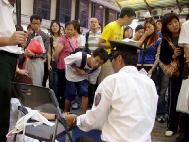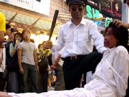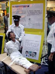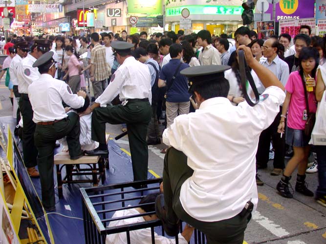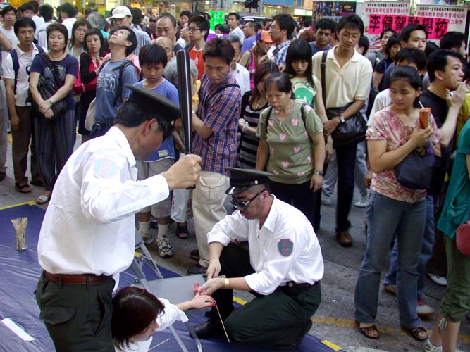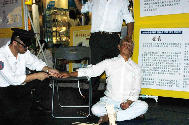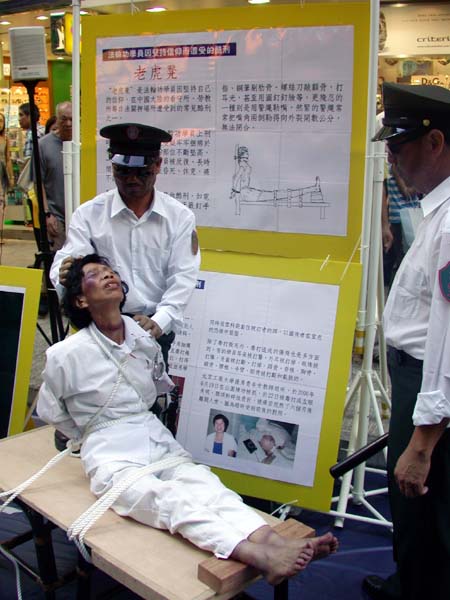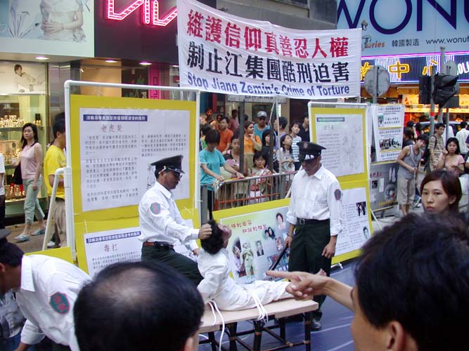 据大纪元新闻网报导,二十六日下午四时半,香港法轮功学员以真人示范了法轮功学员在中国所遭受的其中三种酷刑。据指出,被关押在监狱、劳教所、精神病院、拘留所等地的法轮功学员,被当局动用超过一百种酷刑,强迫他们放弃信仰「真善忍」,若不放弃,便会继续被施以酷刑,直至痛得昏死过去或者死亡。