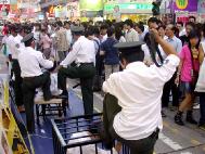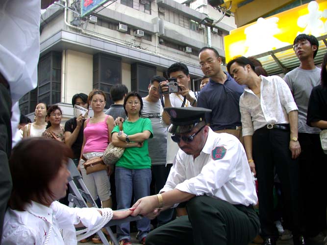 观看表演的途人纷纷表示表演很逼真,不少观看的市民更用手机、数码相机或摄录机拍下「酷刑真人骚」的情景。