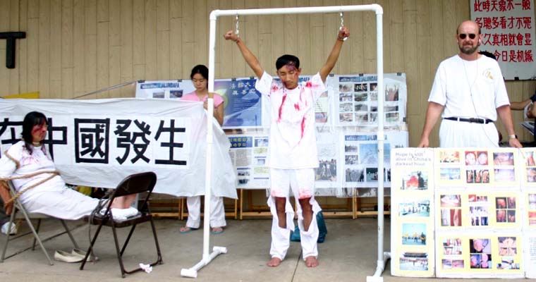 法轮功学员唐女士,她是“酷刑展”中受迫害学员的扮演者之一,她有一段在中国亲身遭受迫害的经历。她99年回中国时,只因她是一位法轮功学员,就被视为“违法”而遭到公安人员的抓捕,被他们强行灌盐水,几乎窒息。
