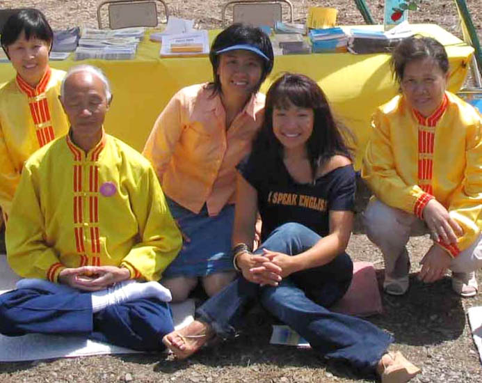 【明慧网2004年6月27日】2004年5月22日,加州圣地亚哥市法轮功学员参加了在Mira Mesa举办的社区健康展览会。参加本次展览会的圣地亚哥KGTV(10频道)的新闻主播金丽安(Kim Lee Ann)女士来到法轮功展位前同学员亲切交谈并合影留念。