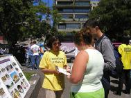 在3位中年华人妇女看完展示后,学员上前询问她们是否知道这些情况。她们回答说,她们周围没有法轮功学员,因而不了解。学员告诉她们,江氏集团一直在掩盖这样的真象。她们说,如果公众知道真实情况,一定不能容忍的。