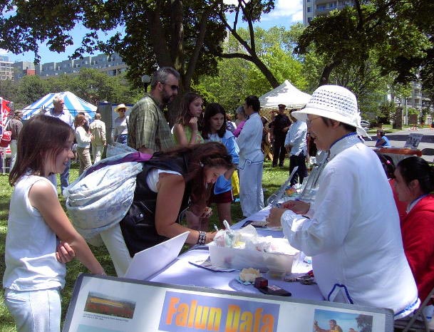 【明慧网2004年6月29日】加拿大法轮功学员参加双城凯琴纳滑铁卢多元文化节,并洪法教功: