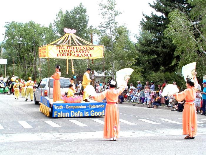 游行后, 学员们在(Eagle) 雄鹰镇的图书馆内教功和介绍了法轮大法, 也向前来学功的人们介绍了法轮大法在中国受到的迫害情况。参加者有老人, 也有小孩, 大家还时不时的提问, 最后, 在圆满的气氛中, 大家在图书馆外的草坪上, 学习了五套法轮大法功法。