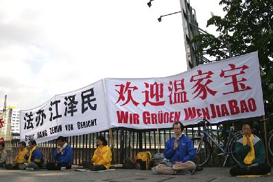 温家宝5月初访问德国时,法轮功学员打出“欢迎温家宝”、“法办江泽民”的横幅。