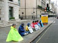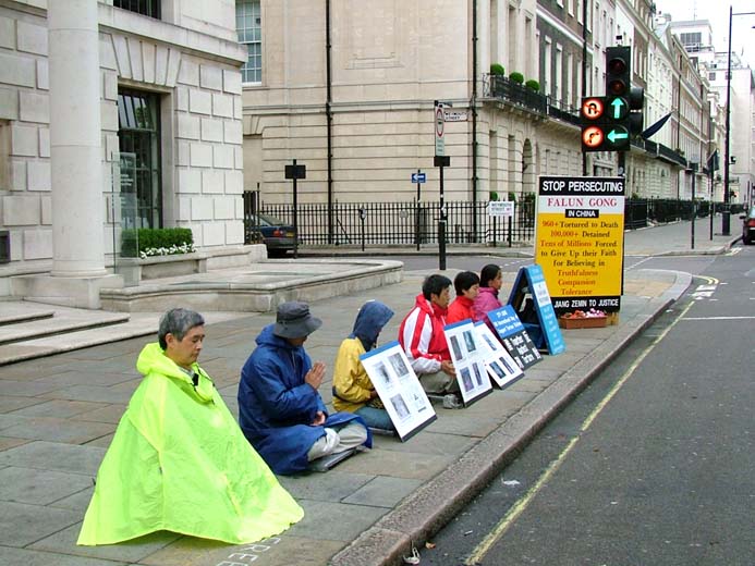 【明慧网2004年6月30日】2004年6月26日是世界反酷刑日,英国法轮功学员在伦敦中国驻英大使馆前举行了和平请愿活动,呼吁社会关注在中国已持续五年的江氏集团对法轮功学员残酷的非法迫害