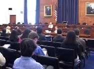 ![]() 听证会现场 | ![]() 听证会的主持人之一 琳•伍尔西议员 |