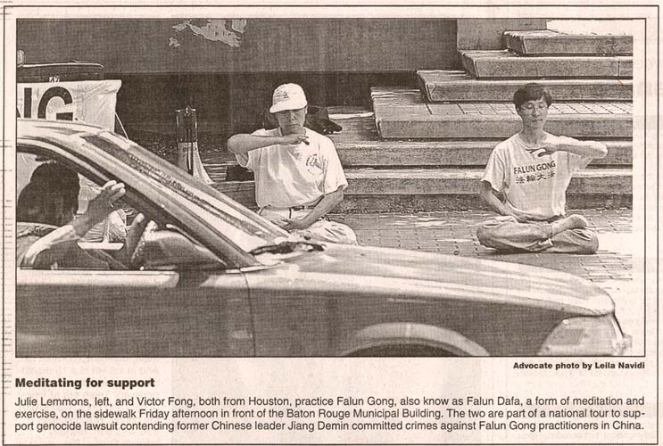 倡导者报5月30日的图片报道说,星期五下午,来自休斯顿的朱丽-莱门斯(左)和维克多-冯在巴特鲁日市政大楼外炼法轮功,法轮功也叫法轮大法,是一种打坐和炼功的功法。他们正在参加一个跨美之旅,支持起诉中国前领导人江××,江被指控在中国对法轮功修炼者犯下了群体灭绝罪。