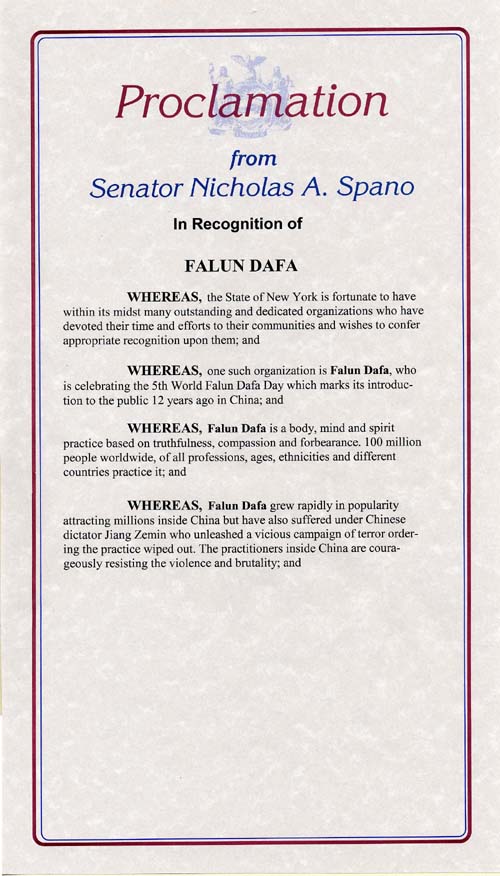 因此,我现在代表纽约州参议院祝愿法轮大法学员不断取得成功,直至达到目地。