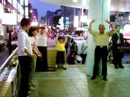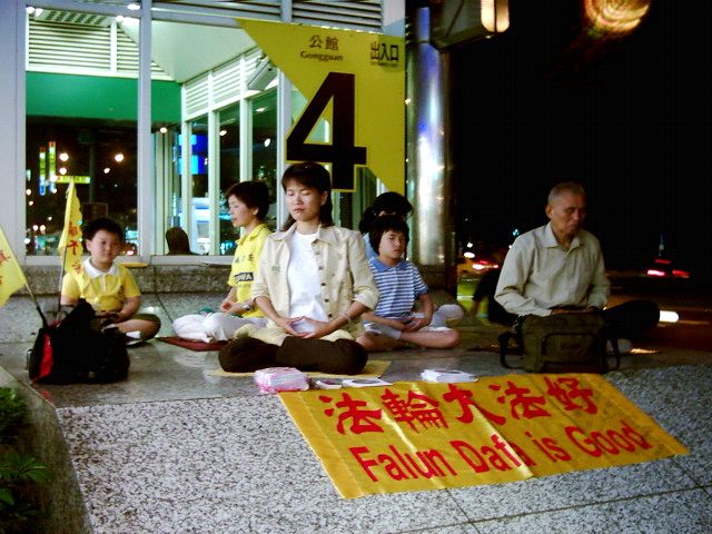 在热闹的街上,黄底红字的「法轮大法好」横幅非常醒目,随风飘动的「真、善、忍」、「法轮大法在台湾」的小三角旗,亦吸引人们的目光。当祥和宁静的炼功音乐响起,立刻吸引捷运站出来的,公车下来的或走路匆匆的行人,甚至等公车、等红绿灯的机车骑士以及公车、计程车、私人轿车、客货车内的驾驶或乘客都循着音乐声转过头来看我们的功法演炼,并有一至二位学员将大法简介、传单、书签及真象光盘适时递给有缘人,并说明法轮大法带给我们身心健康的美好,及讲清江氏集团一手导演的天安门自焚真象、法轮功学员在大陆遭受残酷迫害的情形,以及许多大陆学员因遭迫害而被抄家,开除党籍、军籍,被迫流离失所等情况。